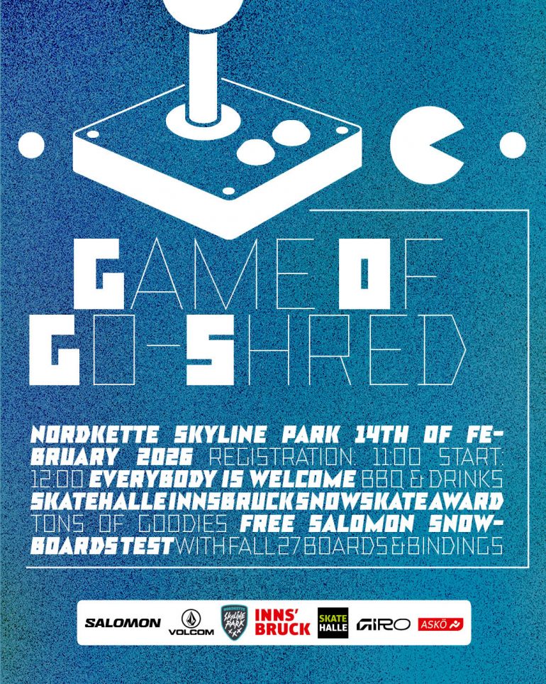 Saturday, 14th of February 2025, we invite you play the GAME of go-shred with us at Nordkette Skyline Park and have a Salomon Snowboards TEST. All new boards from next season will be available for FREE TEST.