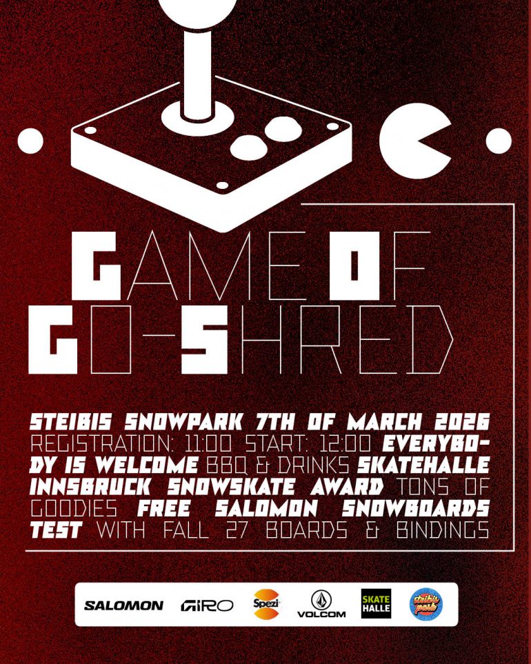 We invite you play the GAME of go-shred with us at Steibis Snowpark. Safe the 7th of March in your agenda beacause we have a sick setup for you, tons of goodies, a filmer and a photographer to catch all the action and to conserve it for eternity.