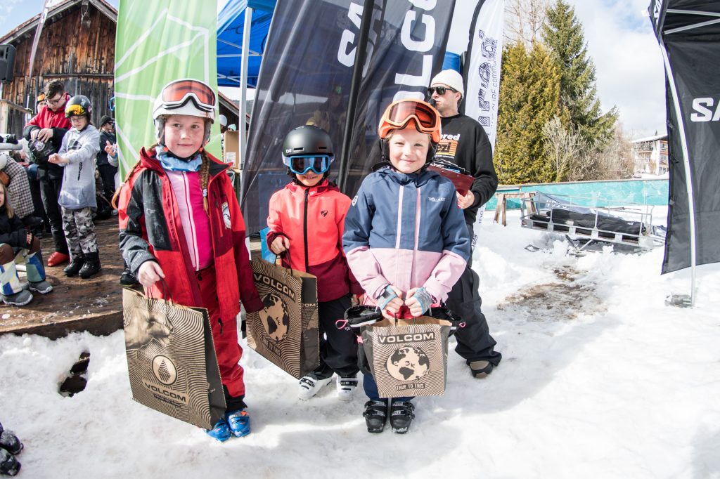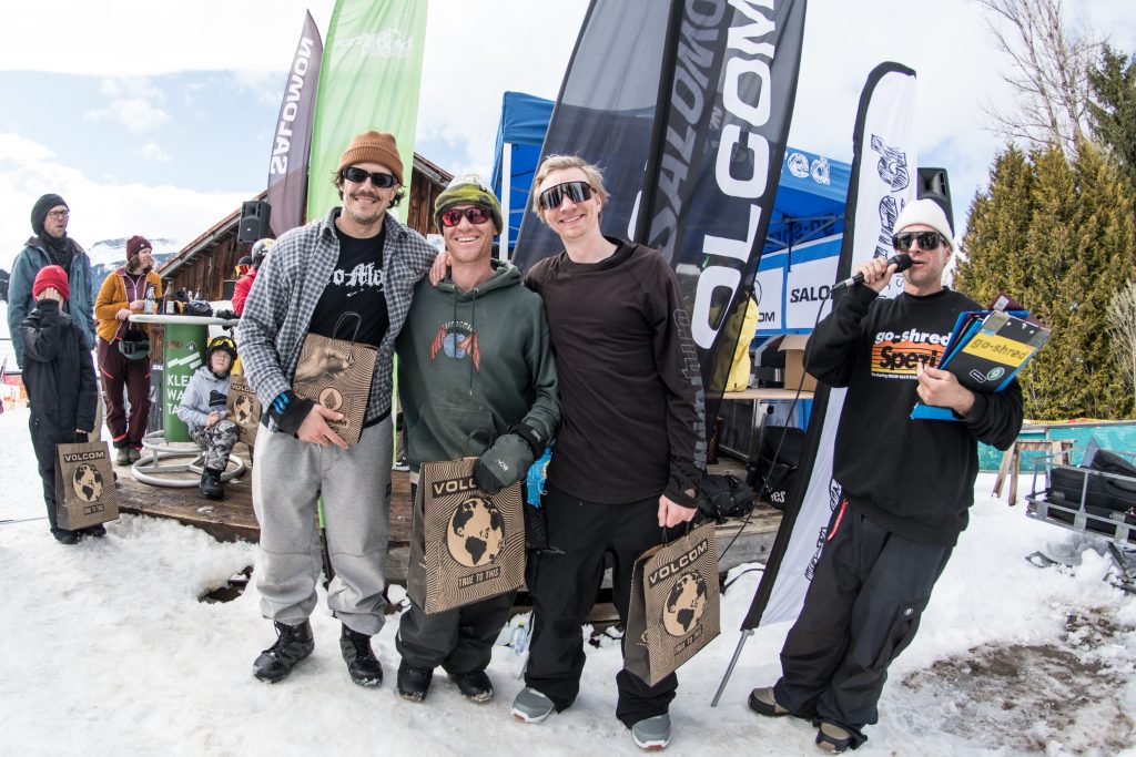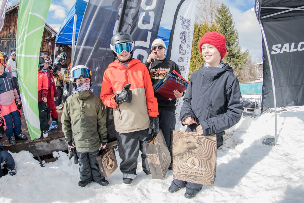 The GAME of go-shred kicked off at 11:00 with registration, and at 12:00 sharp we started the challenges. We were stoked to see so many kids, teens, and adults ready to have fun—it couldn’t have been better. After a rainy morning, the sky cleared up, and we enjoyed sunshine and, of course, spring slush all day. Shredders of all ages came out to improve their skills and soak up the unique atmosphere.